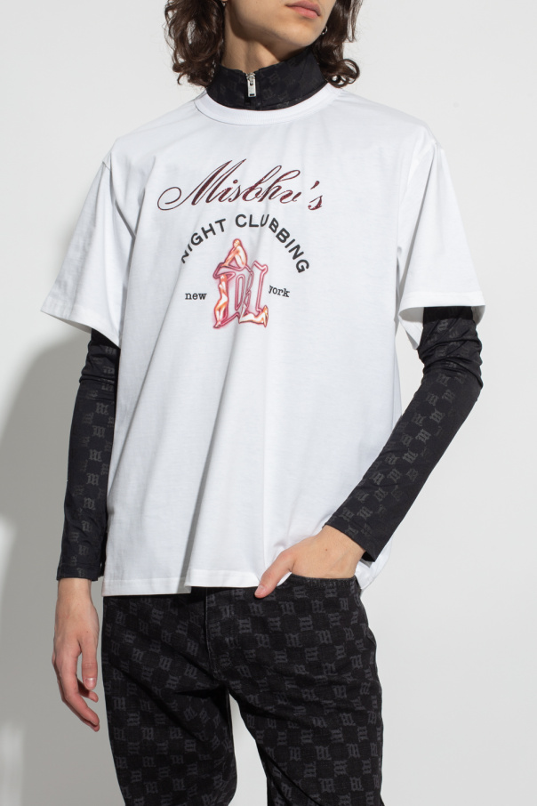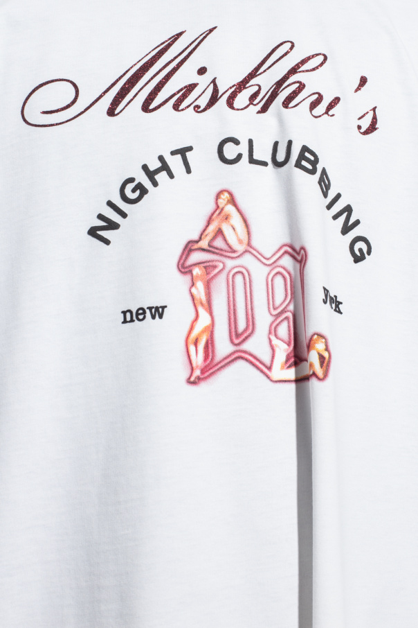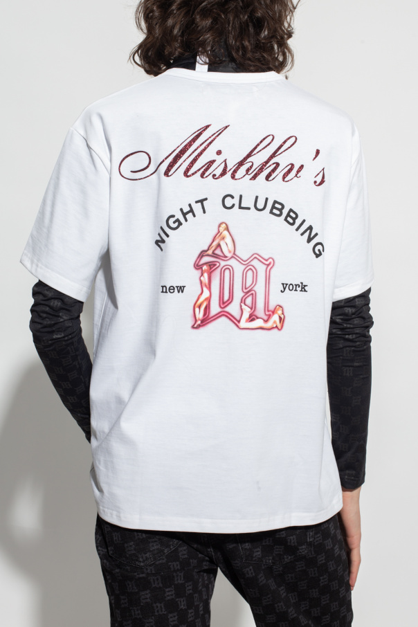 White ‘Night Clubbing’ T-shirt from MISBHV, the ‘Metamorphosis 1993’ collection. This short sleeve design features a printed logo pattern and ribbed crew neck.