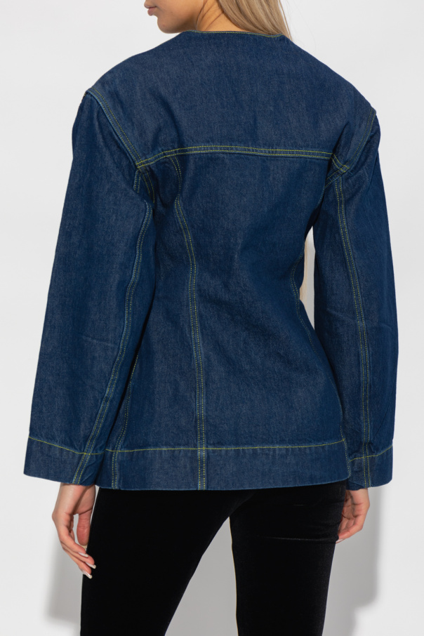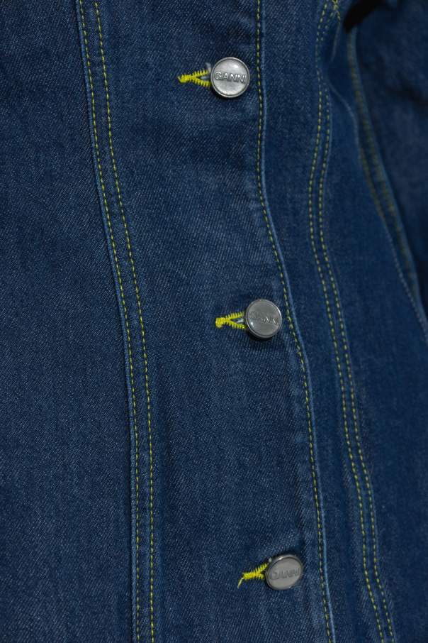 Navy denim jacket with lapels from Ganni. Made of organic cotton, this long sleeve design features button fastenings, yellow stitching and two flap pockets.