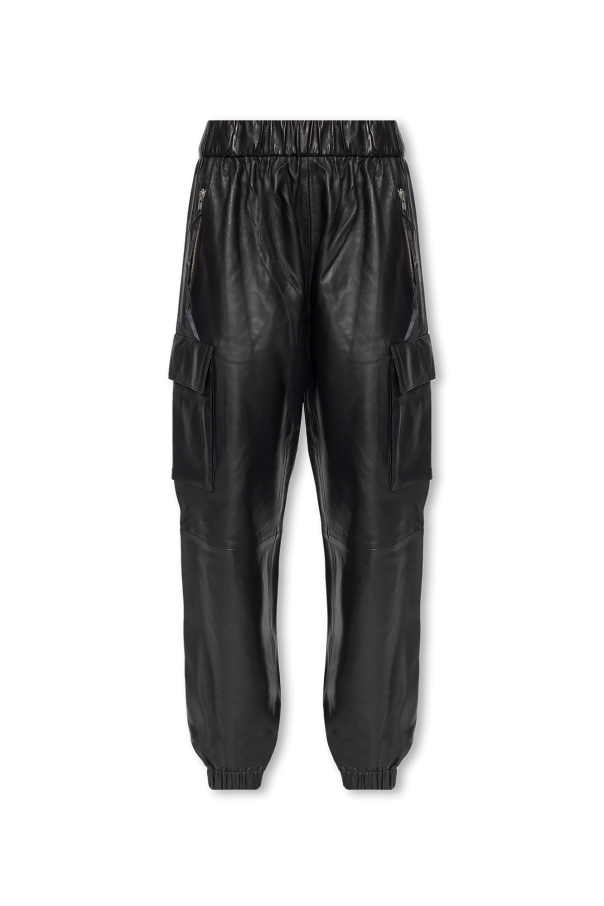 Black ‘Imaya’ trousers from Notes Du Nord. Made from lamb leather, this pair features an elasticated waistband and cuffs and multiple slip and flapped pockets.