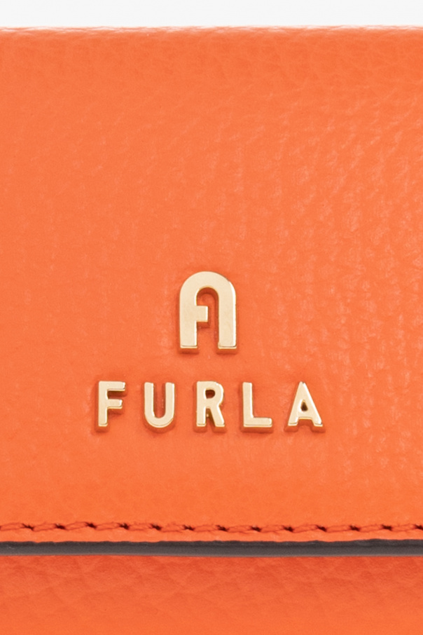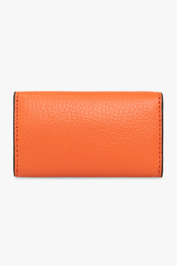 Orange ‘Camelia’ key case from Furla. Made of leather, this item features a snap closure, metal logo appliqué and gold-tone metal hardware. It has one slip pocket, four key hooks and detachable key ring inside.