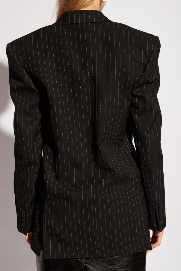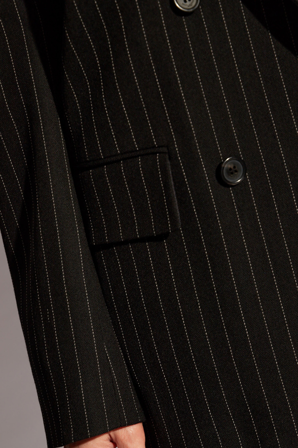 Introducing the epitome of sartorial elegance: the POLO Wool Blazer by Saint Laurent. Crafted with meticulous attention to detail, this blazer showcases a dominant dark hue, elegantly intersected by slim, vertical stripes in a lighter shade, conjuring an effect of refined sophistication. This double-breasted masterpiece features a pair of columns of decorative buttons that stand out against its striped fabric, while its wide, pronounced lapels add a touch of bold character. The blazer\'s composition, primarily wool, ensures both warmth and durability, making it an exquisite choice for any wardrobe. Its tailored, slightly cinched silhouette accentuates the feminine form, complemented by long sleeves and standard buttoned cuffs. Additionally, the presence of two flap pockets and a singular chest pocket enhances both its functionality and style. The precision in the detailing, especially noted in the pocket craftsmanship, speaks volumes of the garment\'s luxurious quality. Why purchase this product? Elegance and Sophistication: The blazer\'s striped pattern and double-breasted design exude a timeless charm. Exquisite Craftsmanship: Saint Laurent\'s commitment to quality is evident in the meticulous detailing and superior fabric blend. Versatile Style: Perfectly suited for formal events or elevating everyday wear. Durability: The wool composition guarantees a piece that remains pristine over time.