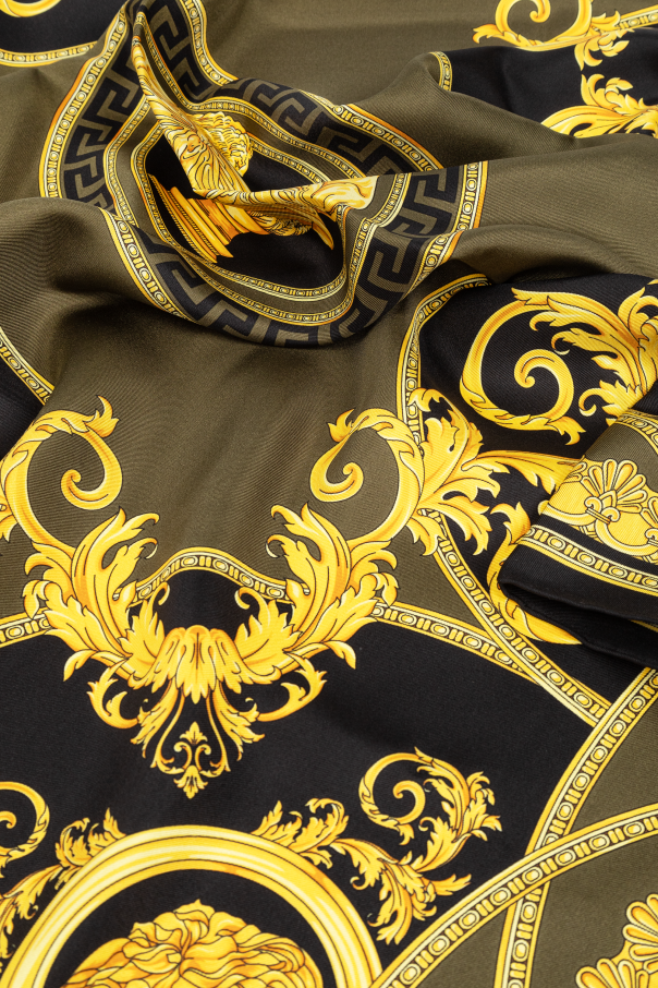 Introducing an epitome of sartorial elegance and luxurious design, the Versace Silk Scarf. Crafted from the finest 100% silk, this square-shaped accessory exudes a sleek, glossy finish that is undeniably opulent. The scarf is adorned with a complex, symmetrical pattern that blends botanical and geometric motifs, rendered in a striking black and gold palette that evokes the grandeur of Baroque and Rococo styles. Spiraling lines and ornate embellishments further enhance its aesthetic appeal, while stylized portraits and distinctive elements hint at the designer\'s signature touch. This exquisite piece is not just a testament to high fashion but also showcases versatility in styling, demonstrated through varied arrangements across genders, making it a truly unisex accessory. Whether laid flat to admire its detailed design or elegantly draped over the shoulders, the Versace Silk Scarf transforms any ensemble into a statement of luxury and sophistication. Why Purchase This Product? Made from 100% high-quality silk, ensuring a smooth, lustrous texture. Features a striking black and gold color scheme with intricate, symmetrical patterns for a luxurious look. Versatile styling options for both men and women, enhancing any wardrobe with its unisex design. Embellished with signature Versace motifs, adding an exclusive touch of designer prestige.