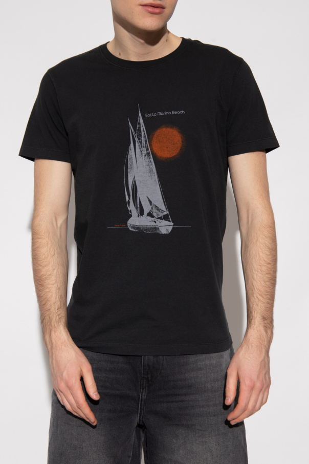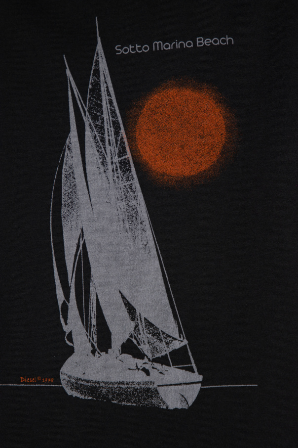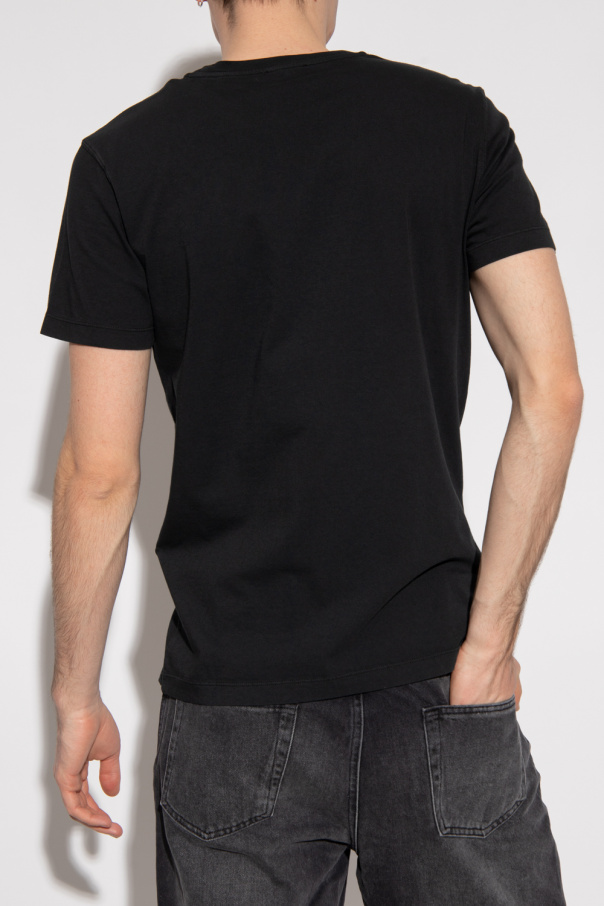 Dark grey ‘T-Iny C2’ T-shirt from Diesel. Made of cotton, this style features short sleeves, an elasticated collar and a light grey and orange graphic print.