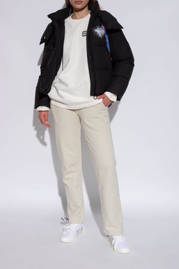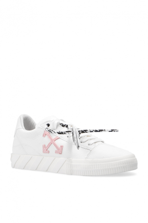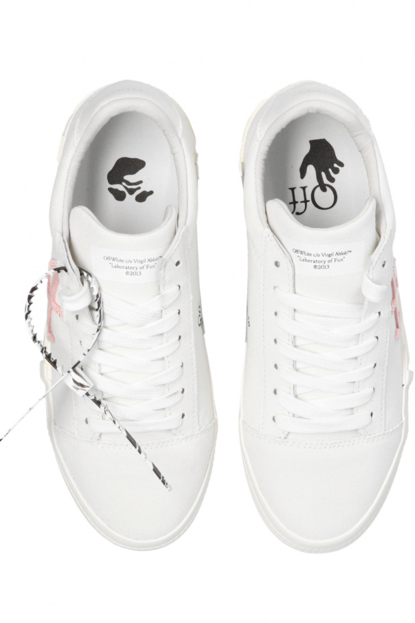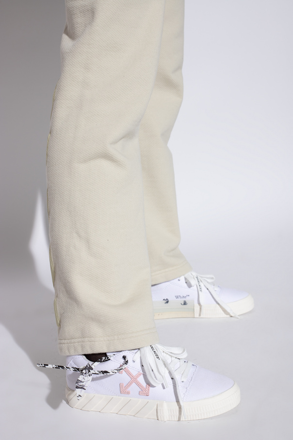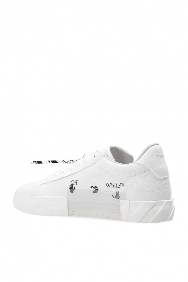 White ‘Low Vulcanized’ sneakers from Off-White. Crafted from faux suede, this lace-up pair features a logo printed on the tongue, the label’s signature black and white zip tie and a cream rubber sole with a transparent insert.