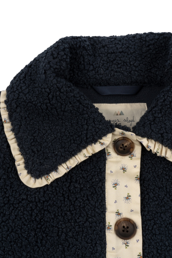 Navy blue and cream jacket from Konges Slojd. Made in fleece, this style fastens with button and features a floral motif and two slip pockets.
