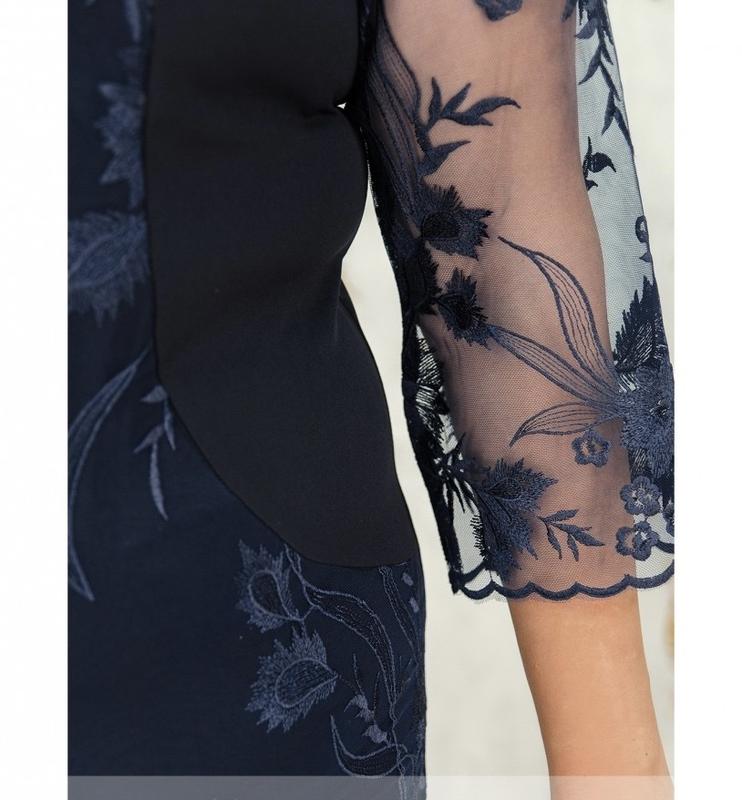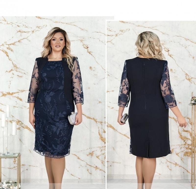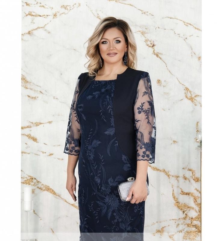 Приталенное платье больших размеров покорит ваше сердце с первого взгляда своим оригинальным фасоном. Платье А-силуэта, с полукруглым вырезом горловины, без карманов и застёжек. На плечи изнутри подшиты накладки, которые делают линию плеч более ровной. Платье двуслойное спереди: от горловины до подола подшит второй слой из сеточки с цветочным узором. Визуально платье выглядит, словно на него накинута жилетка из гладкой ткани. Спинка полностью гладкая. Рукава длиной ¾. Платье будет хорошо сочетаться с однотонной обувью на каблуке любой высоты.