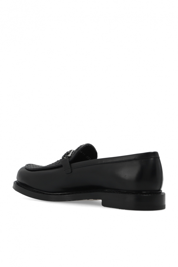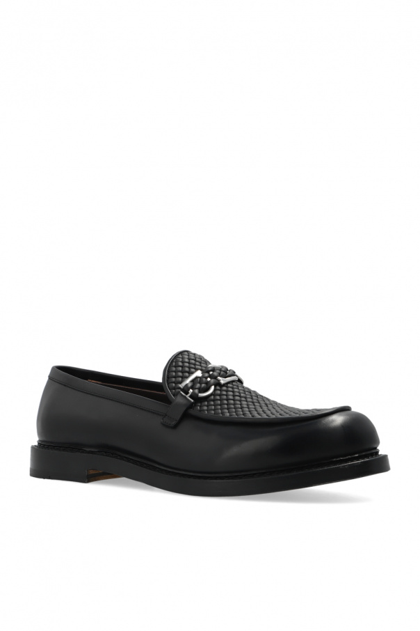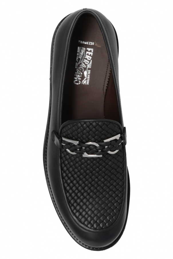 Black moccasins from Salvatore Ferragamo. Crafted from calf leather, this model features a decorative hand-made weave, metal Gancini buckle in silver-tone and beige leather sole.