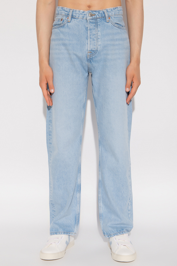 Blue ‘Eddie’ jeans from Samsoe Samsoe. Made from organic cotton, this pair falls with straight legs and features a zip fly with a button, classic five pockets and a beige patch at the back.