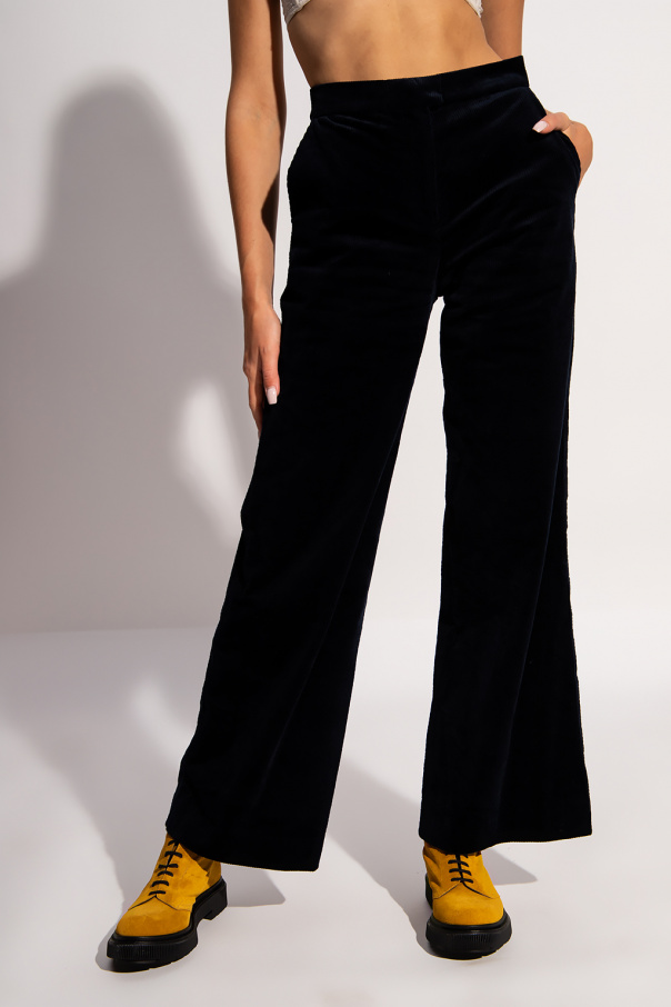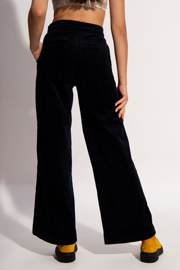 Navy blue corduroy trousers from Samsoe Samsoe. Crafted from organic cotton, this pair falls down with flared legs and features a zip fly with hook & eye closures and two front slip pockets.