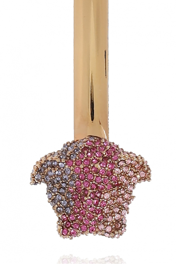 Gold-tone hair pin from Versace. Made of brass, this item is decorated with the iconic raised Medusa head appliqué and encrusted with pink and purple crystals.