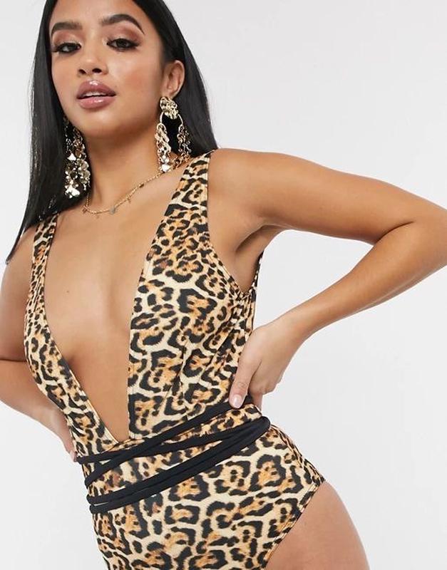 Слитный купальник с глубоким вырезом, поясом и леопардовым принтом фирмы ASOS.