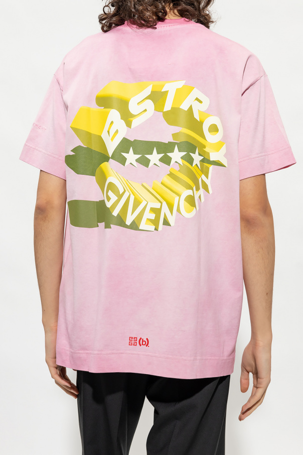 Pink crewneck T-shirt from Givenchy. Crafted from cotton, this style features short sleeves, a colourful graphic print and yellow embroidery.