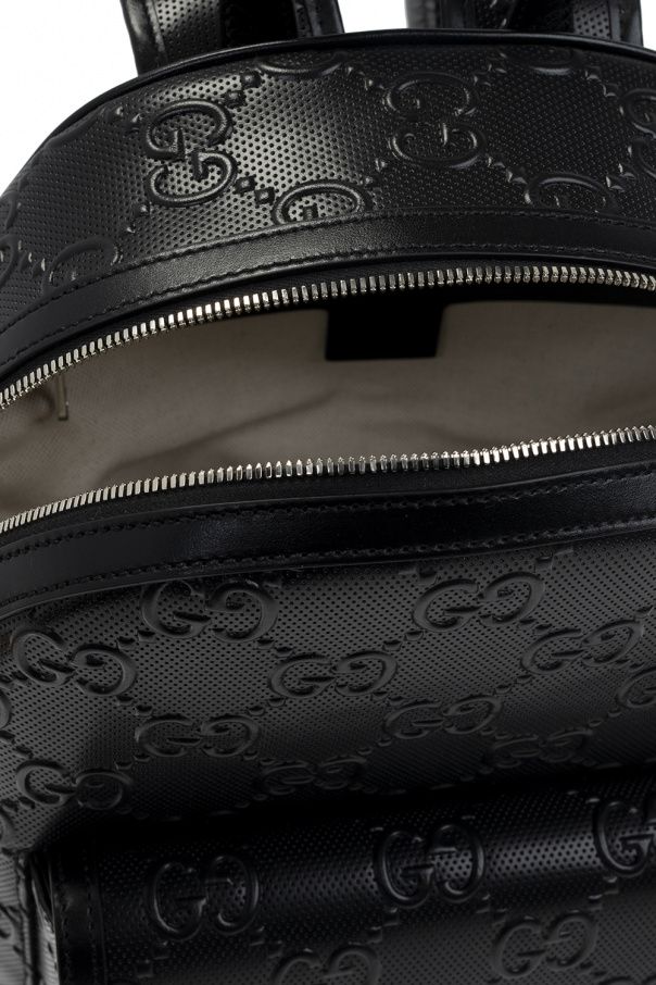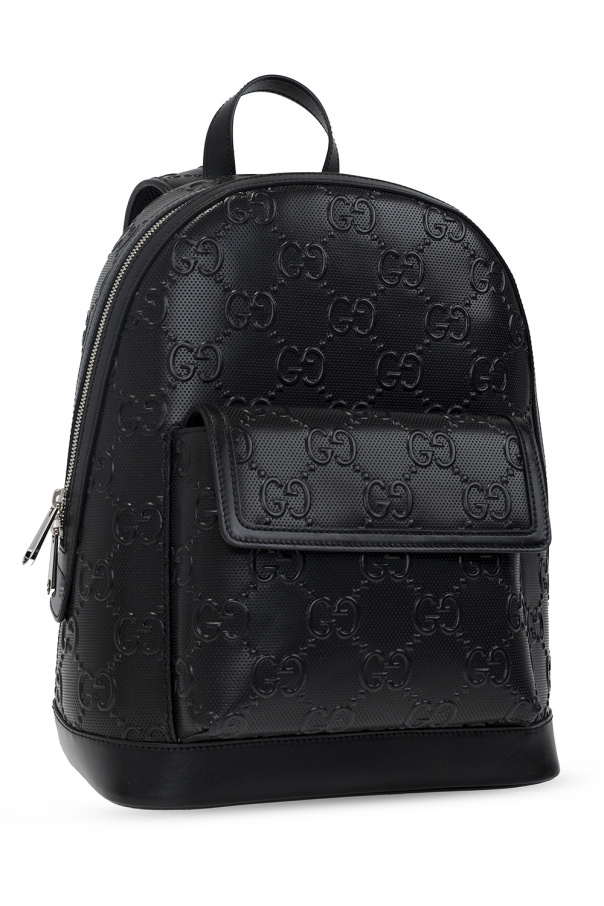 Black backpack from Gucci. Made of logo-embossed leather, this model fastens with a two-way zip. It is complete with a pocket fastened with a magnetic snap, half-round handle, adjustable shoulder strap, silver-tone metal hardware and one internal compartment with one zip pocket and two slip pockets.