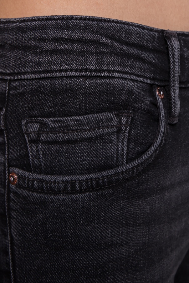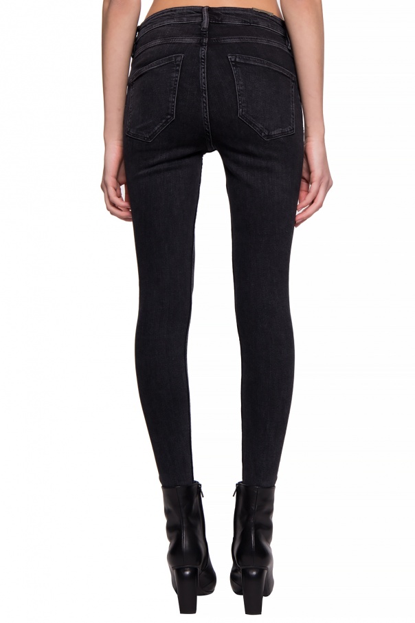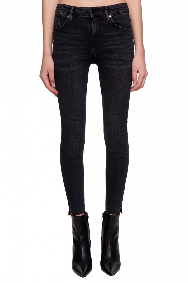 Dark grey ‘Dax’ high-waisted skinny jeans from AllSaints. Zip and button fastening. Two slip pockets on the front, two at the back. Raw-trimmed cuffs.