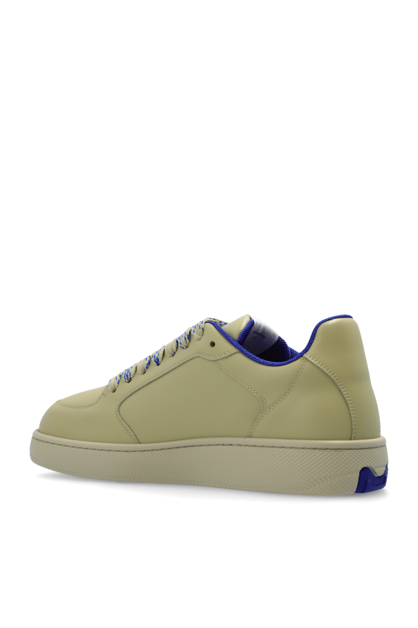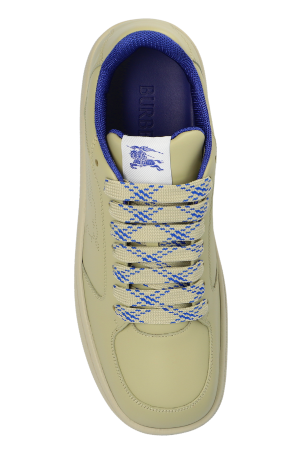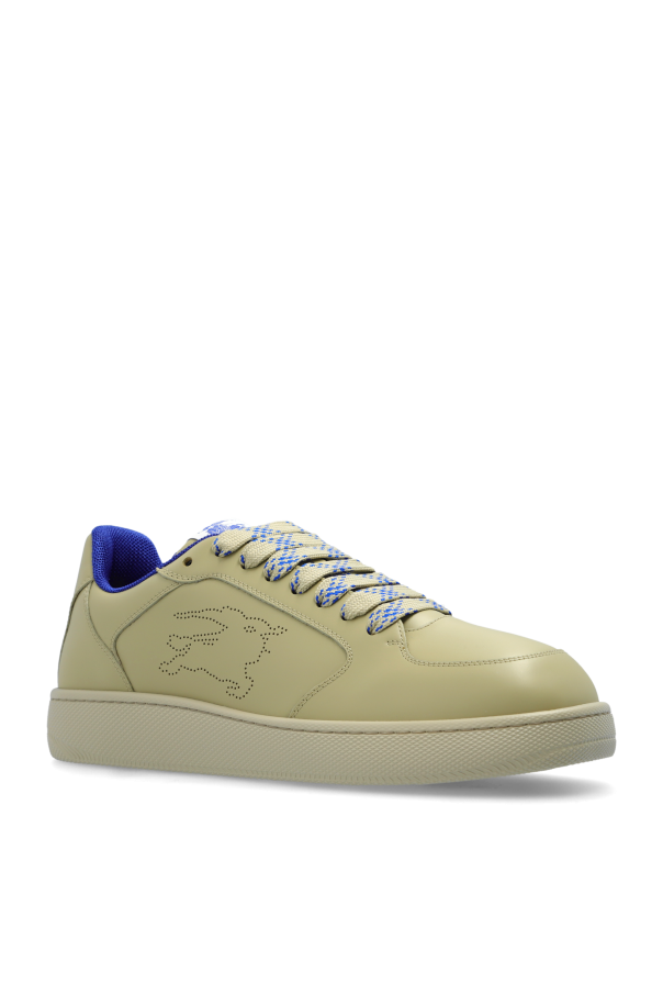 Introducing the Leather Sports Shoes from the illustrious house of Burberry. An epitome of sophistication, these low-top sneakers exude a refined elegance, characterized by their sleek and minimalist design. Crafted from premium leather, these shoes boast a luxurious texture and durability. The classic silhouette of the shoes, reaching just below the ankle, ensures a timeless appeal. The monochromatic green hue enhances their understated charm, making them a versatile addition to any wardrobe. Subtle yet distinctive details set these sneakers apart. The embossed logo of a galloping horse adorns the sides, while beige laces with blue accents add a touch of contrast. The interior is lined with a soothing blue material, providing a plush feel. A white patch with the blue Burberry logo graces the tongue, further accentuating the brand\'s heritage. The solid rubber sole offers exceptional comfort and traction, making these shoes perfect for both casual and semi-formal occasions. Embrace the blend of luxury and functionality with these exquisite sneakers. Why Purchase This Product? Exquisite Craftsmanship: Made from high-quality leather. Timeless Design: Classic low-top silhouette in a versatile green hue. Distinctive Details: Embossed logo, contrasting laces, and branded tongue patch. Comfort and Durability: Solid rubber sole for superior comfort and traction. Renowned Brand: From the prestigious Burberry collection.