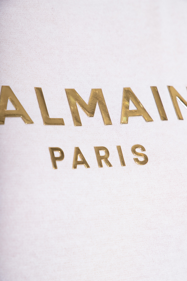 Cream beach dress from Balmain. Made of cotton, this short sleeve design features a gold-tone logo pattern and ribbed neck.
