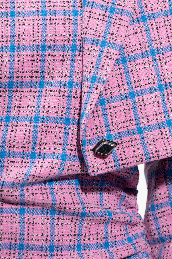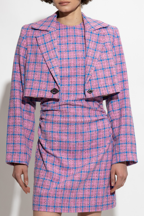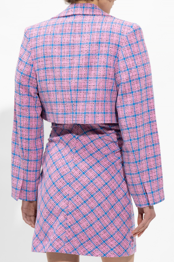 Pink, blue and black, checked, cropped blazer from Ganni. Fastened with a hook, this garment is crafted from organic cotton and has notch lapels and long sleeves.