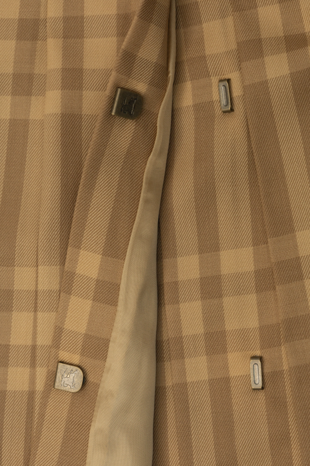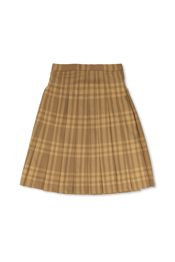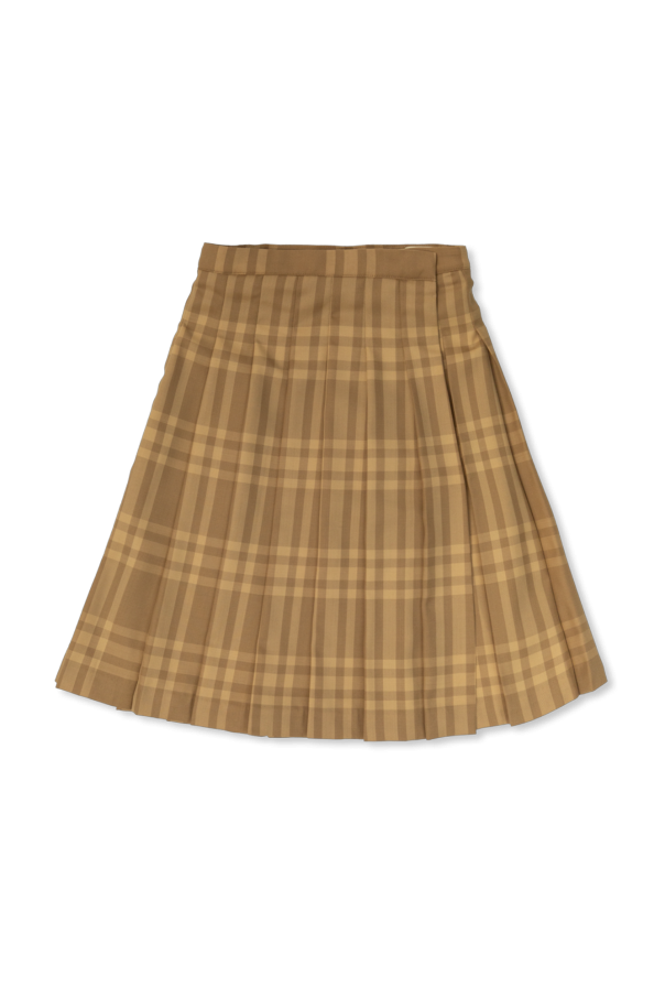 Discover the Pleated Plaid Skirt from the illustrious Burberry Kids collection, a masterful blend of classic elegance and modern sophistication. Rendered in a dominant beige plaid pattern, this skirt epitomizes the timeless allure of luxury children\'s fashion. Crafted with a meticulous attention to detail, the skirt\'s outer layer is made from premium wool, exuding both durability and opulence, while the interior is lined with sumptuous cupro for a smooth, comfortable fit. The metal closures inside ensure longevity and a touch of refined elegance, complemented by a discreet \"BURBERRY\" label, a hallmark of high fashion. This exquisite piece is designed for girls aged 4 to 14, encapsulating Burberry\'s renowned British aesthetic through its thoughtful design. With its wrap-around button and hook fastening, it offers both practicality and style, making it a versatile addition to any wardrobe. Why choose this product? Iconic Design: Classic plaid pattern with a modern twist. Premium Materials: Luxurious wool exterior and soft cupro lining. Renowned Brand: Burberry\'s signature elegance and quality. Exclusive Appeal: Perfect for discerning young fashionistas.