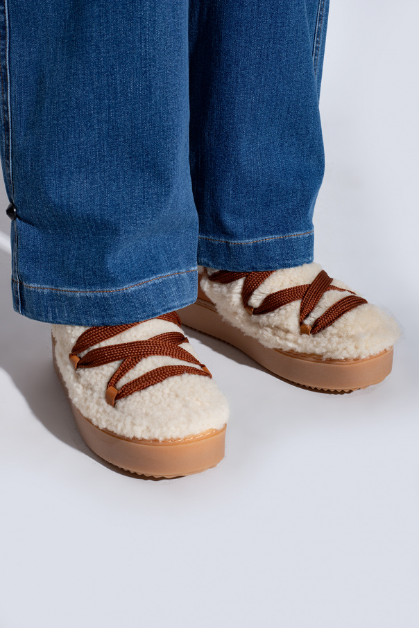 Cream and brown 'Mary' snow boots from See By Chloé. Crafted from lamb leather and fur, this model features a lace-up front and back, logo-embossed leather panelling at the back and a light brown rubber sole at the base.