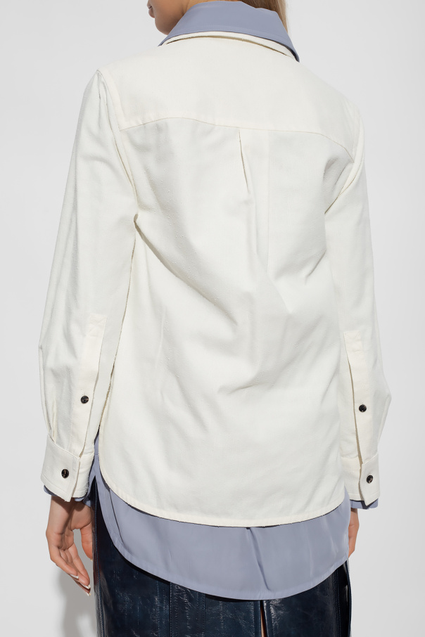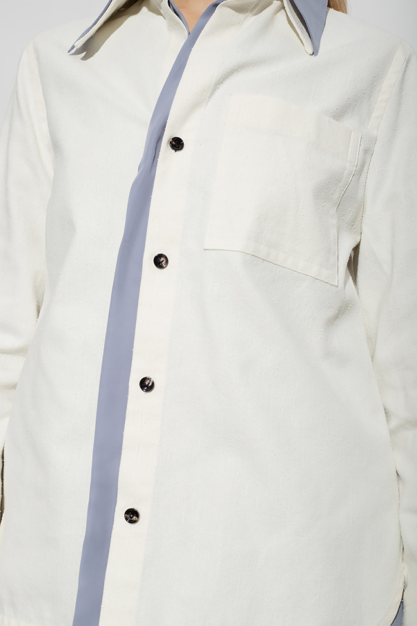 Two-layer shirt in cream and grey from Bottega Veneta. Crafted from textured cotton and semi-sheer material, this style fastens with buttons and features a slip chest pocket, double collar and cuffs and long sleeves with button closures.
