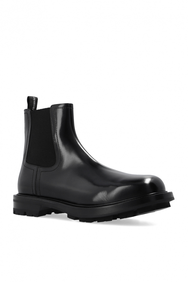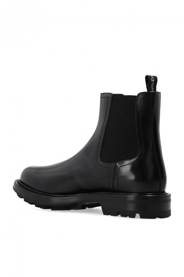 Black Chelsea boots from Alexander McQueen. Made of leather, this pair features elastic side panels and a black rubber sole.