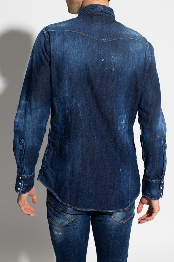 Navy denim shirt from Dsquared2. Fastened with snaps, this distressed garment features a paint splatter effect, two snap-fastened flap pockets and long sleeves with snap-fastened cuffs.