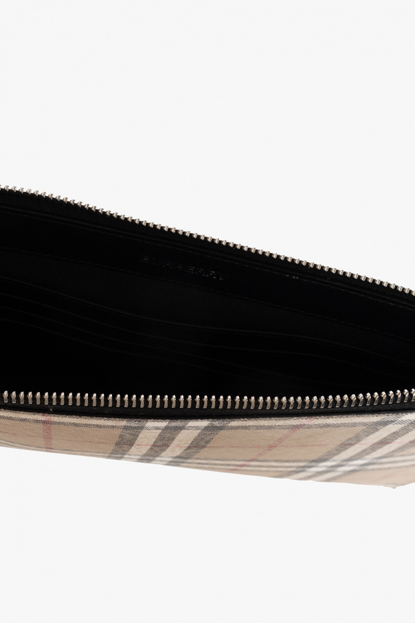 Beige handbag from Burberry. Made of canvas with the brand’s signature check pattern, this model features a zip fastening, wrist strap to the side, silver-tone metal hardware and one internal compartment with six card slots.