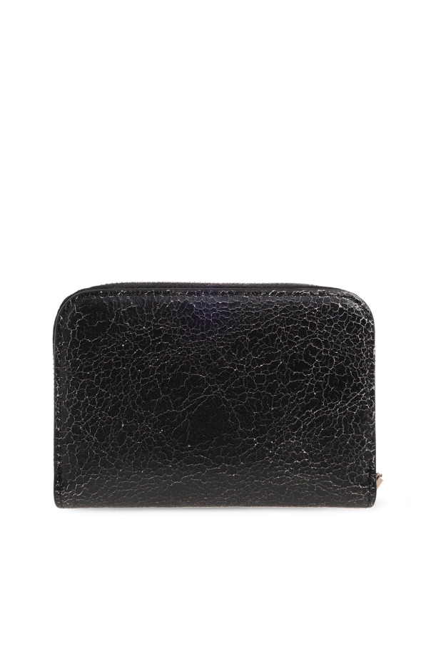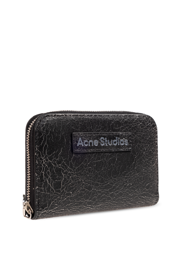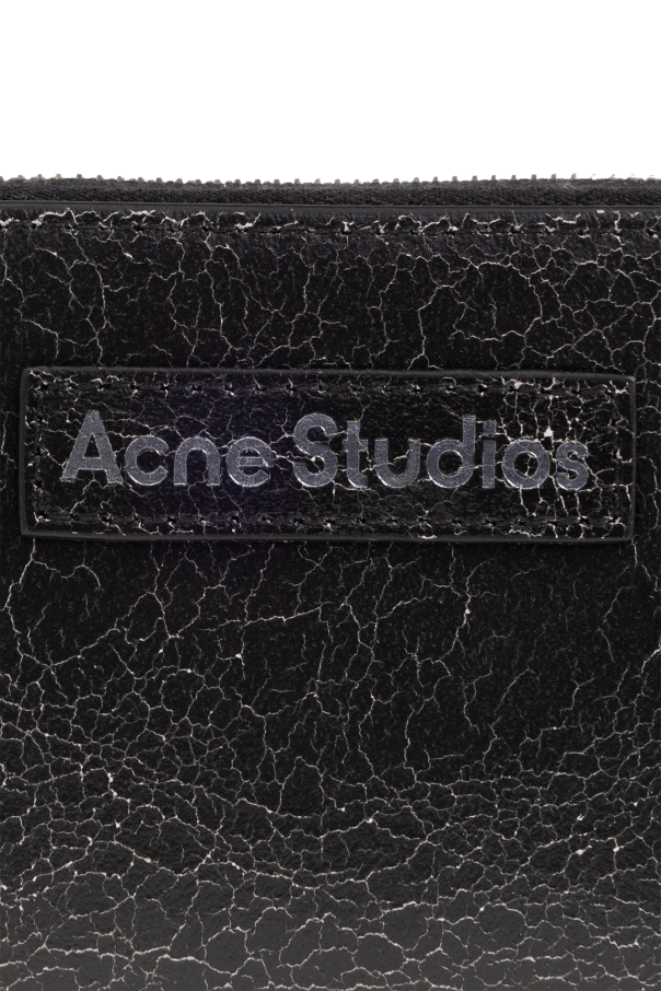 Black wallet from Acne Studios. Made from leather with a cracked finish, this item fastens via a zip and showcases a logo patch on the front and three internal compartments.