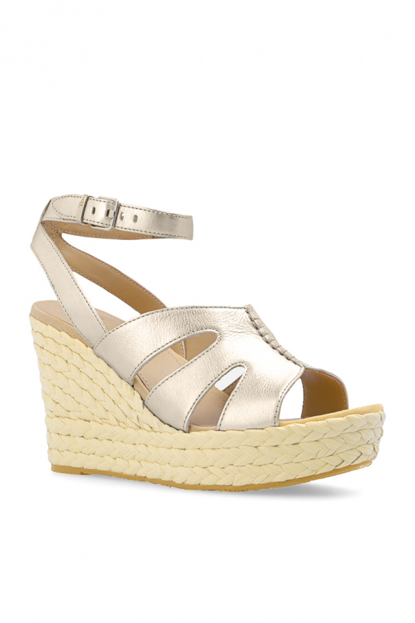 Gold-tone ‘Careena’ wedge sandals from UGG. Made of leather, this model features an ankle buckle strap fastening, distinctive topstitched detailing on the front and a brown rubber sole with a beige raffia overlay.