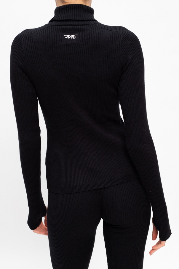 Black ribbed turtleneck sweater from Reebok x Victoria Beckham. This long sleeve design is enriched by a cut-out detail and white logo embroidery.