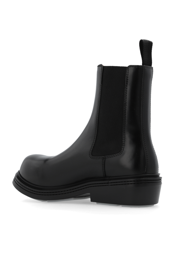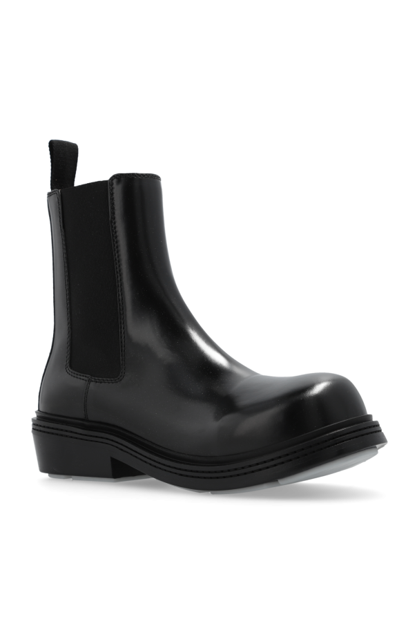 Black ‘Fireman’ ankle boots from Bottega Veneta. Made of leather with a slip-on silhouette, this model sits on a black and grey rubber sole and features a round toe and a back pull tab.