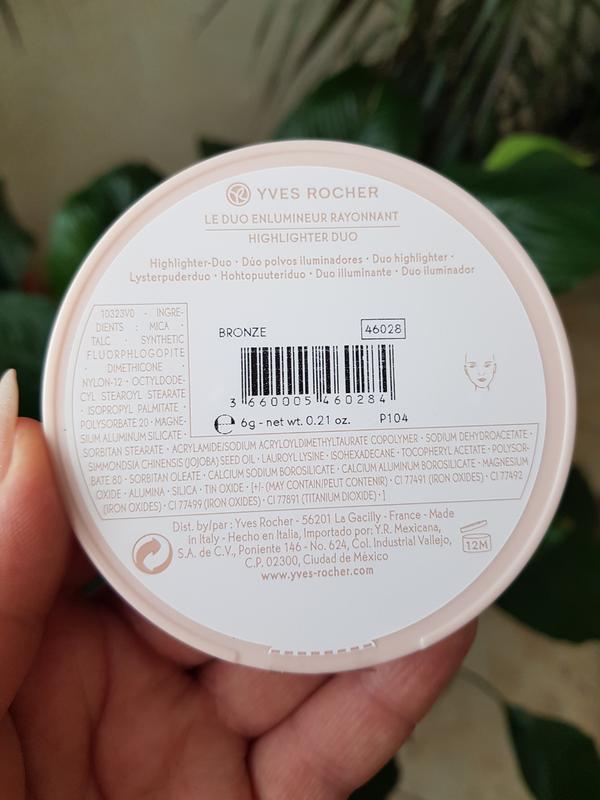 Yves Rocher Highlighter Duo “Bronze” Хайлайтер-дуэтФормула хайлайтера запеченная, удобная в нанесении, с малейшего касания отдает максимум пигмента на кисть. Хайлайтер очень пигментированный, легко растушевывается, текстуру кожи не подчеркивает. Его вполне можно использовать и вместо теней, на веках выглядит также красиво как и на лице. По сравнению с кремовой версией, этот хайлайтер более сияющий, более яркий и нарядный. Не упустите возможность приобрести шикарную лимитированную вещь по хорошей цене.