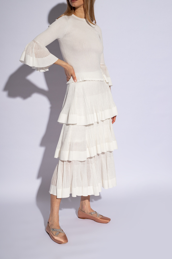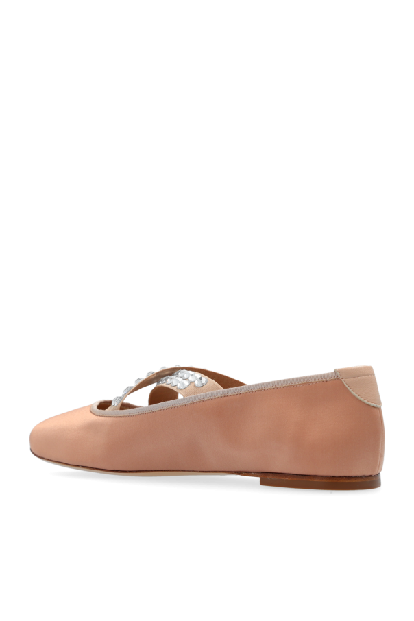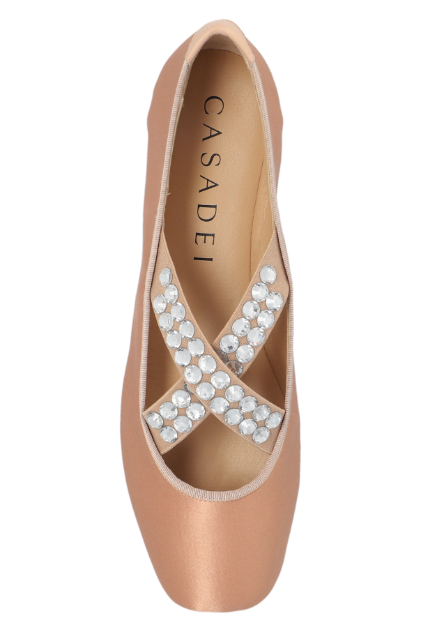 Light pink ‘Satin’ ballet flats from Casadei. Made of satin fabric, this pair features elastic straps embellished with crystals, rounded toe and beige leather sole.