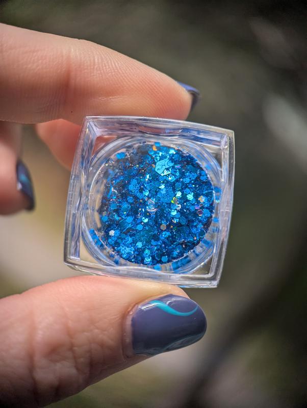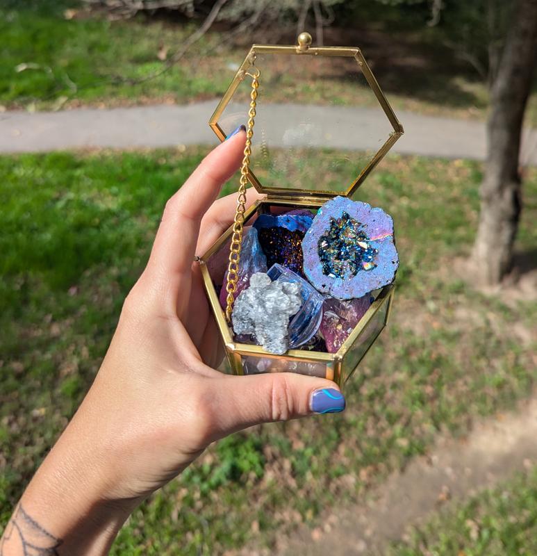 Шкатулка стеклянная с камнями (турмалин синий, гальванический кристалл, агат жеода, аметист, блестки, стеклянная звездочка)