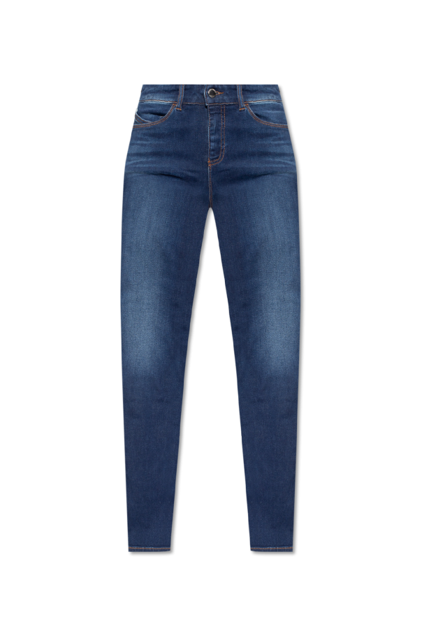 Blue ‘J18’ slim fit jeans from Emporio Armani. Fastened with a button and zip, this pair has a logo patch at the back and five slip pockets.