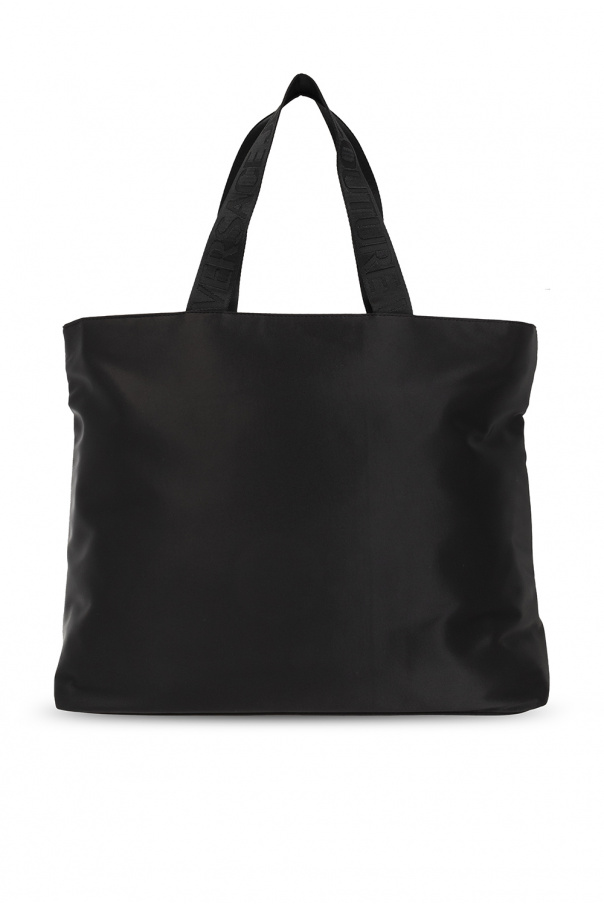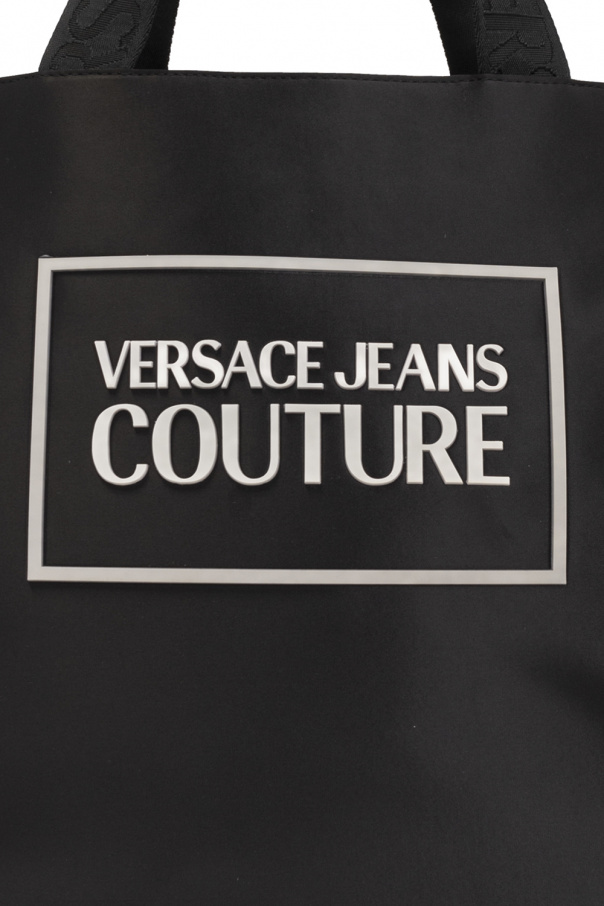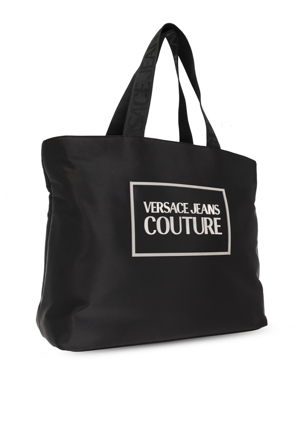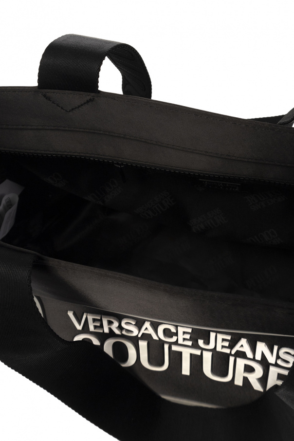 Black shopper bag from Versace Jeans Couture. Accentuated with a grey and white rubber logo detail on the front, this design features a zip fastening, two half-round straps and one internal compartment with one zip pocket and one slip pocket.