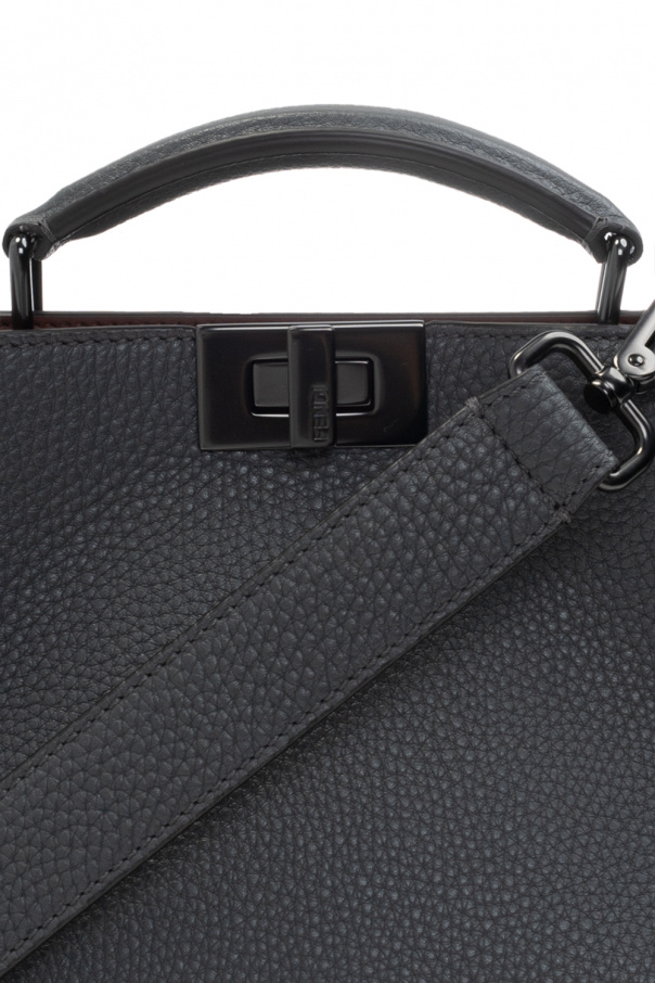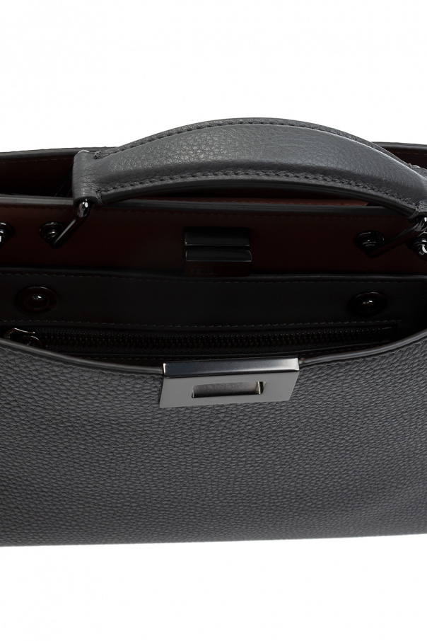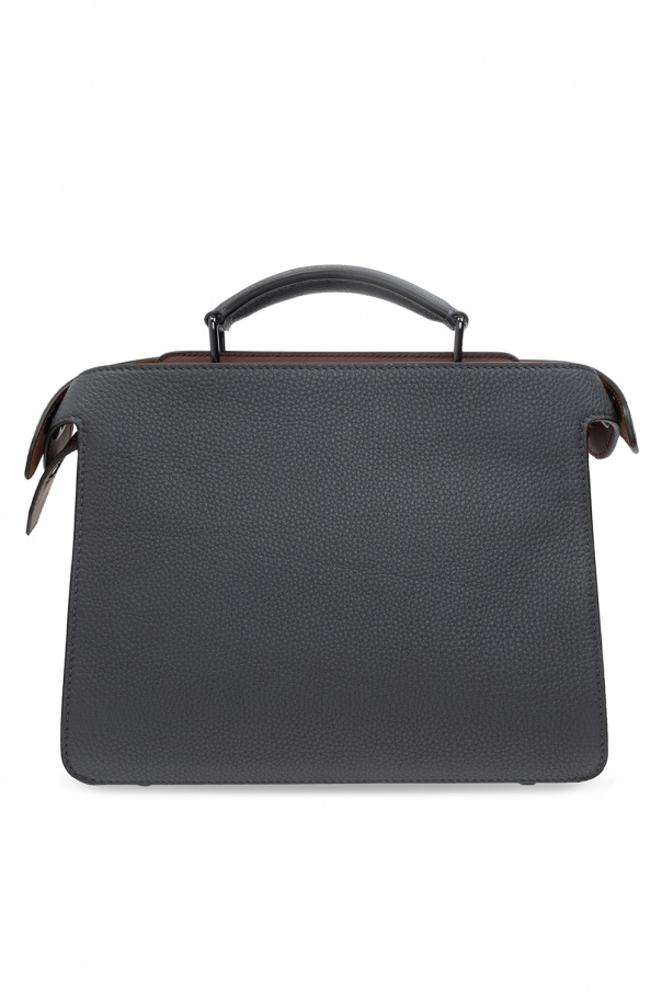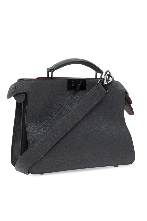 Grey shoulder bag from Fendi. Crafted from leather, this design is complete a decorative logo-embossed closure, half-round handle, detachable and adjustable shoulder straps as well as grey metal hardware. The interior features orange and maroon lining, two internal compartments and one zip pocket.