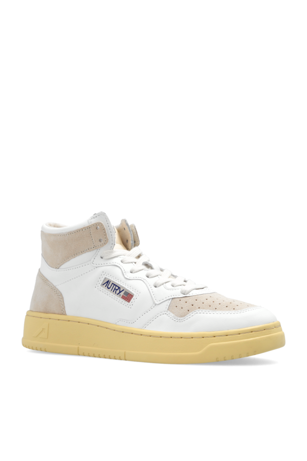 White and light beige ‘AUMW’ high-top sneakers from Autry. Crafted from leather and fabric, this lace-up model sits on a yellow rubber sole and showcases the brand\'s logo and perforations on the toe.