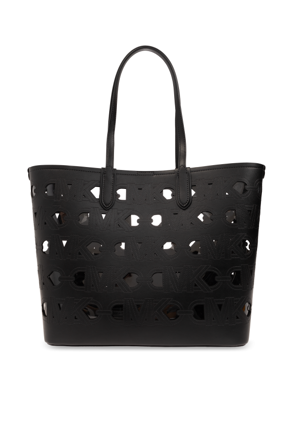 Introducing the \'Eliza\' Shopper Bag by Michael Michael Kors - a paragon of sophistication and utilitarian design. Crafted with impeccable precision, this rectangular-shaped tote boasts a sleek black hue, rendering it a versatile accessory for any ensemble. The bag\'s distinct feature, a perforated pattern interwoven with the designer\'s monogram, adds a layer of intrigue and luxury, subtly showcasing the brand\'s identity. Made from premium leather, the \'Eliza\' ensures durability while maintaining a refined aesthetic. Its vertical handles are designed for comfort, allowing the bag to be effortlessly carried over the shoulder. This piece lacks external pockets, embracing a minimalist philosophy that enhances its elegance. The magnetic snap closure secures your belongings, while the interior compartment offers ample space for daily essentials. Why Purchase the \'Eliza\' Shopper Bag? Versatile Elegance: Its timeless black color and modern design make it suitable for both casual outings and formal events. Exceptional Craftsmanship: Constructed from high-quality leather, promising longevity and resilience. Unique Design Details: The perforated pattern with the designer\'s monogram adds an exclusive touch of sophistication. Functional Comfort: Designed with ergonomic handles for easy shoulder carry and secured with a magnetic snap for convenience.