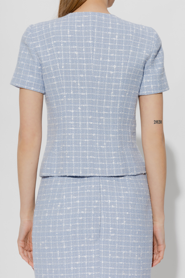 Light blue and white top from Emporio Armani. Crafted in checked tweed, this style features a zip fastening with a concealed placket, a round neck, short sleeves and two frontal pockets.