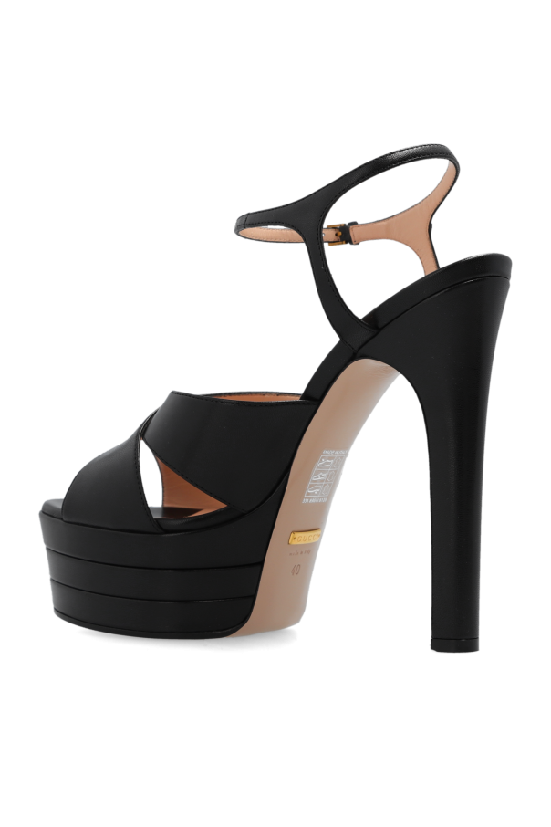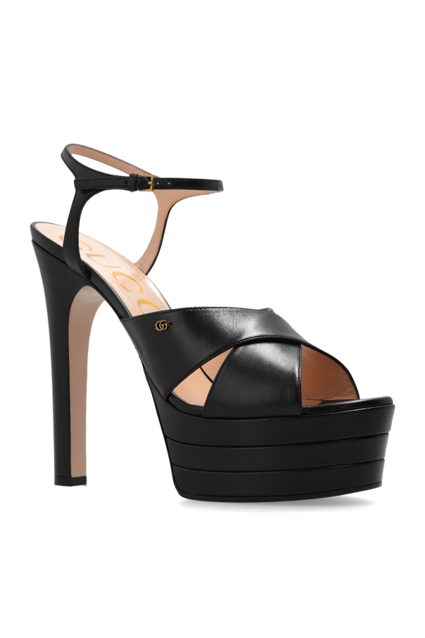 Black platform sandals from Gucci. Made from leather with an almond-shaped toe, this model sits on a cream leather sole and features an adjustable ankle strap fastening and Double G hardware on the side.