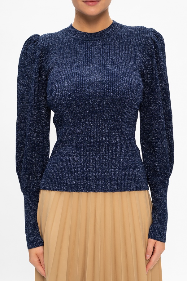Navy ribbed sweater from Samsoe Samsoe. This design is inlaid with silver-tone lurex yarn and has puff sleeves with ribbed cuffs.