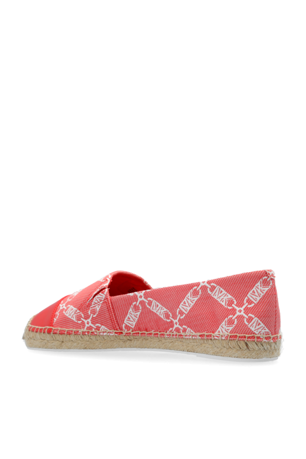 Introducing the \'Kendrick\' Espadrilles by Michael Michael Kors, a testament to the fusion of luxury and leisure. Crafted with an eye for detail, these espadrilles boast a vibrant red canvas adorned with a white jacquard monogram pattern, evoking a sense of exclusivity and brand identity. The classic, slip-on design ensures ease of wear, embodying the casual elegance that is synonymous with summer footwear. The breathable textile upper is complemented by a faux leather trim, culminating in a metal logo emblem in gleaming gold at the toe, lending an air of sophistication. The rounded toe is fortified with a rubber material, enhancing durability while seamlessly blending with the espadrille\'s dominant red hue. Underfoot, the beige jute sole, characteristic of traditional espadrilles, is thoughtfully finished with a white rubber border, offering both style and practicality. Why Purchase This Product? Exquisite Craftsmanship: Expertly woven with a jacquard monogram pattern, showcasing the meticulous attention to detail. Signature Appeal: The Michael Michael Kors logo, both on the inner lining and as a gold-tone metal adornment, signifies the designer\'s hallmark of luxury. Uncompromising Comfort: A padded interior ensures comfort for the wearer, making these espadrilles a delight to wear all day. Durable Design: The reinforced toe and rubberized sole edges offer enhanced durability, making them a reliable choice for everyday elegance.
