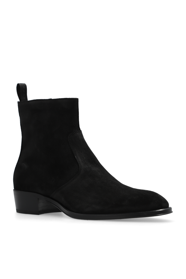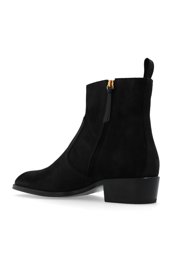 Black ‘Ludhovic’ ankle boots from Giuseppe Zanotti. Made of suede, this pair features a side zip, short handle with logo at the back and a black leather sole.