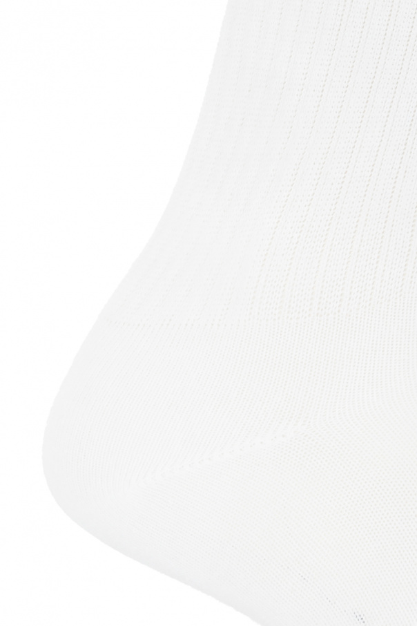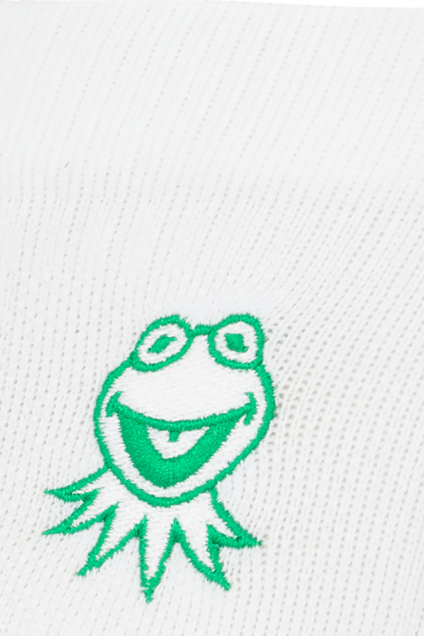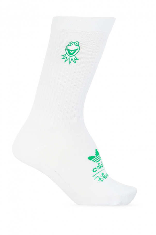 White ribbed socks from ADIDAS Originals x Disney, the ‘Primegreen’ line. Embroidered with Disney’s Kermit, this pair is complete with ribbed cuffs. ‘Primegreen’ is a line that uses recycled materials in the production of high-quality products.