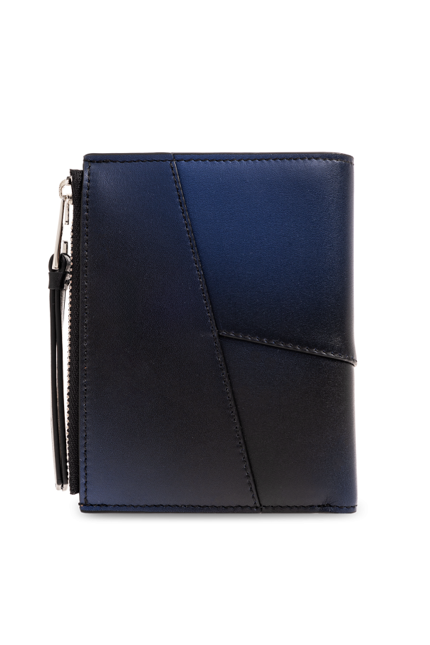 Black and navy blue wallet with a gradient effect from Loewe. Made from calf leather, this item fastens via a snap and showcases an embossed logo, asymmetrical patches, one zip coin pocket as well as one bill compartment, four slip pockets and six card slots.