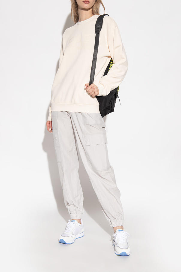White and blue sneakers from Emporio Armani. Sitting on a blue rubber sole, this lace-up model showcases the brand\'s logo and glittery inserts in silver-tone.