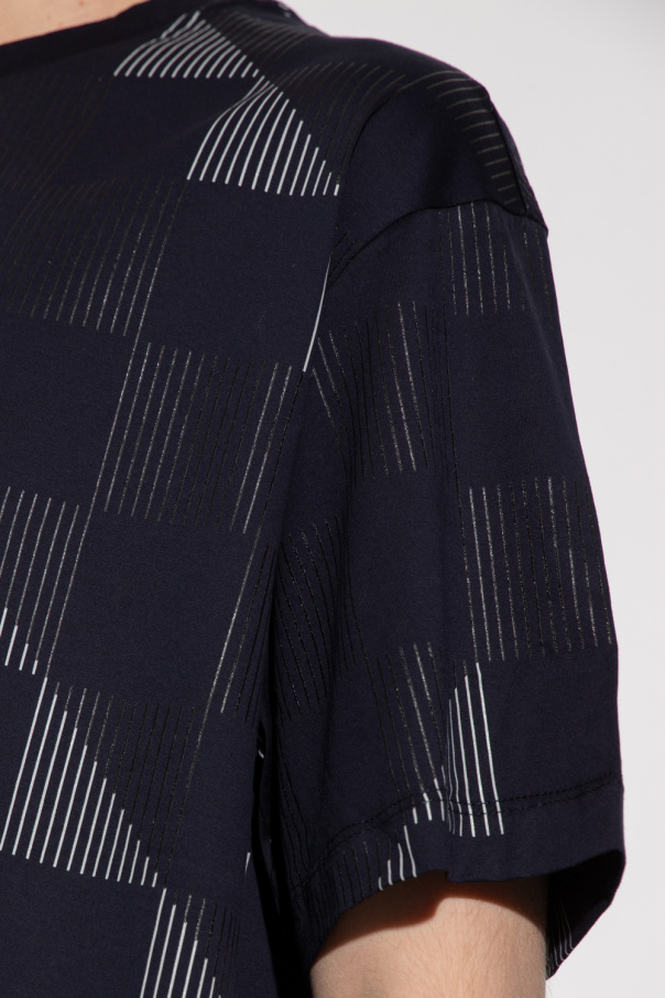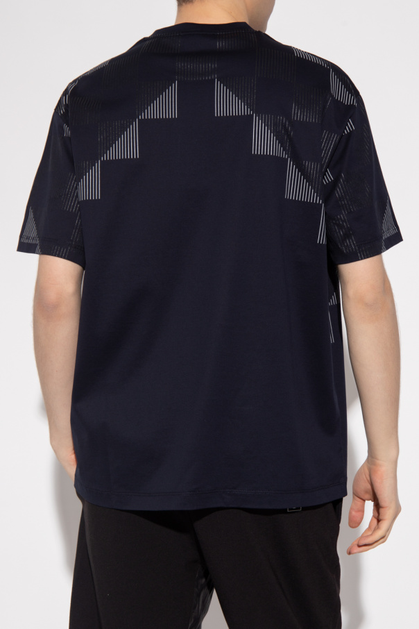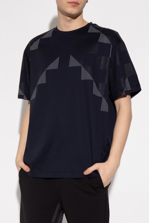 Navy T-shirt from Emporio Armani. Crafted from cotton, this short sleeve design has a white and grey geometric print and a ribbed crew neck.