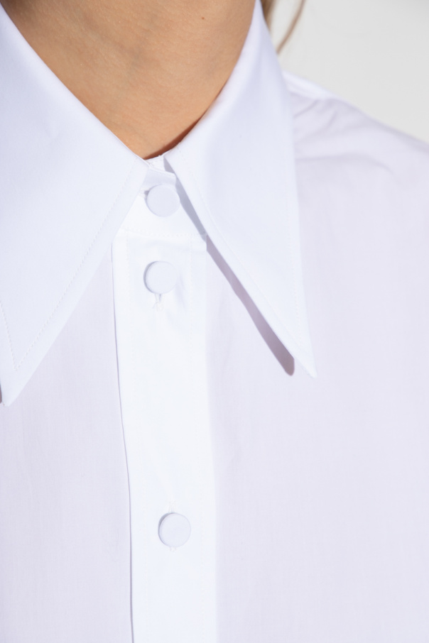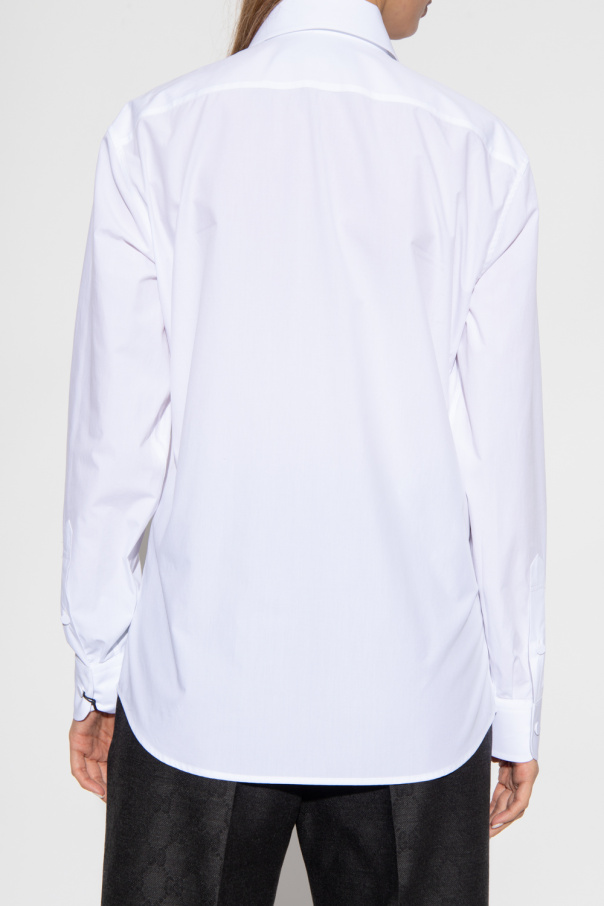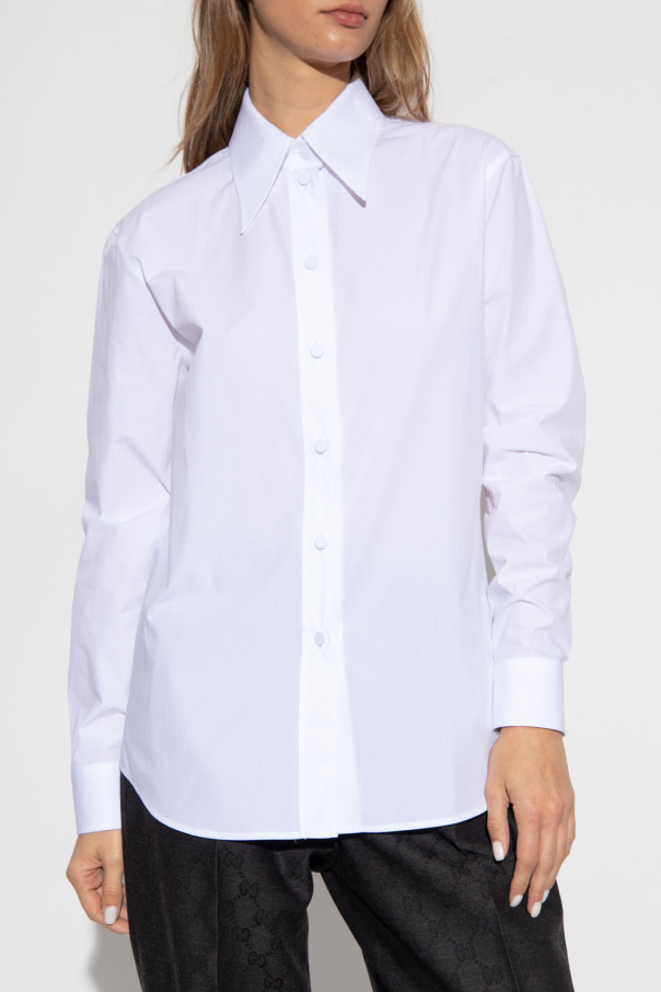 White shirt from Gucci. Crafted from cotton poplin with a form-fitting silhouette, this style features a pointed collar, button fastenings and long sleeves with button cuffs accentuated with ’Interlocking G’ monogram embroidery.