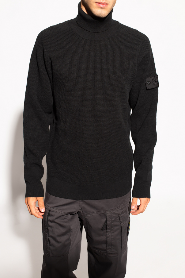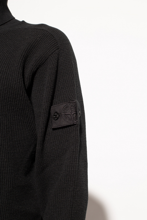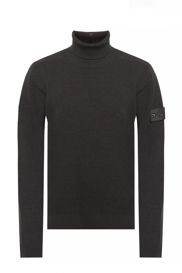 Dark green sweater from Stone Island. Crafted from wool with all-over ribbing, this style showcases a standing collar, elasticized edges and a detachable black logo patch.